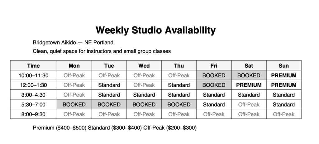 A clean, quiet space in NE Portland for instructors who want to run their own classes, programs, or workshops.